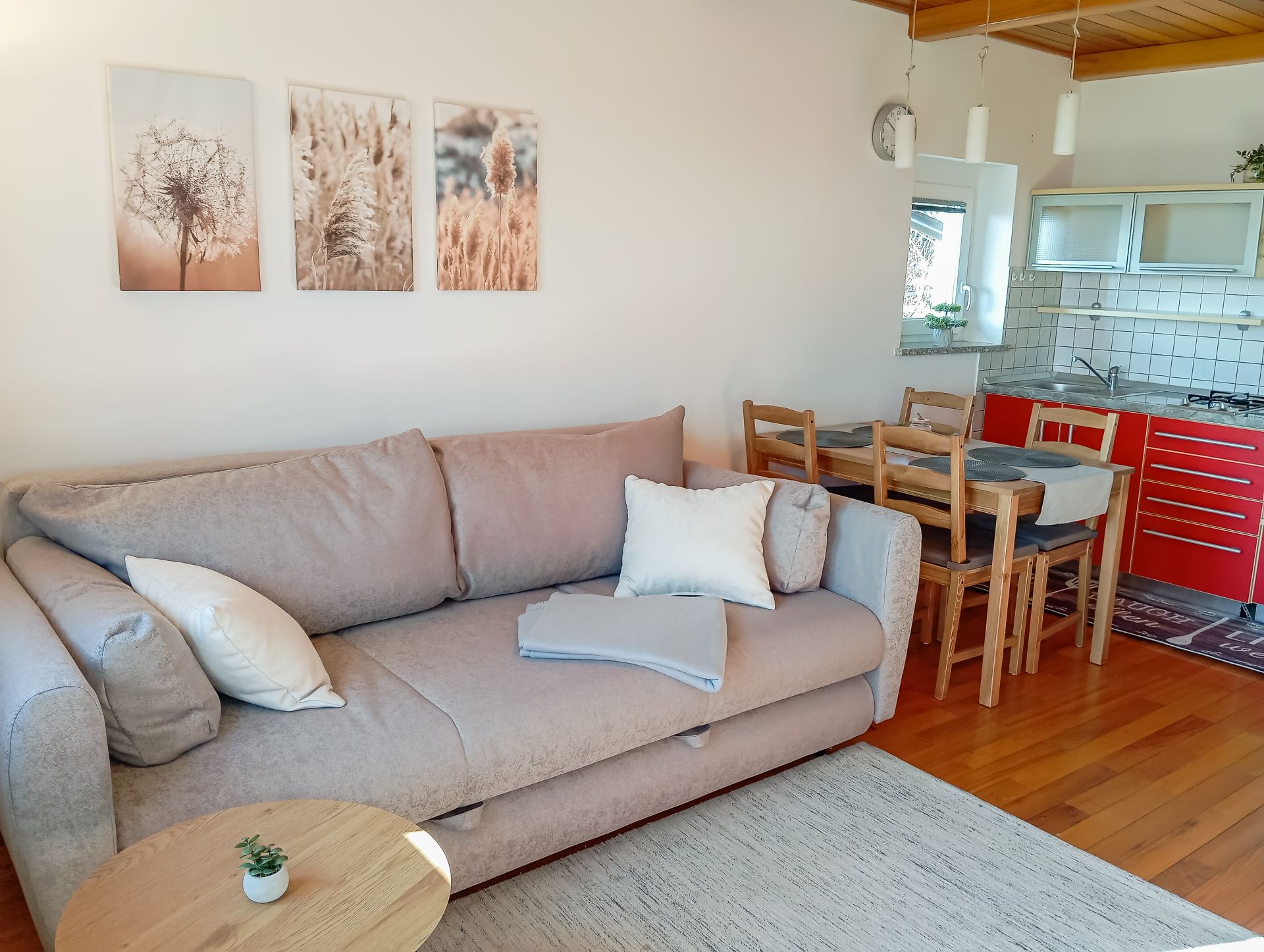 Guests can enjoy their morning coffee or a glass of evening local wine on the balcony or on the terrace or veranda. You can enjoy on the lounger in the shade of a cherry tree. Just want to take it easy around after a hard day's hiking? Curl up on the sofa and enjoy your favourite series on Netflix.