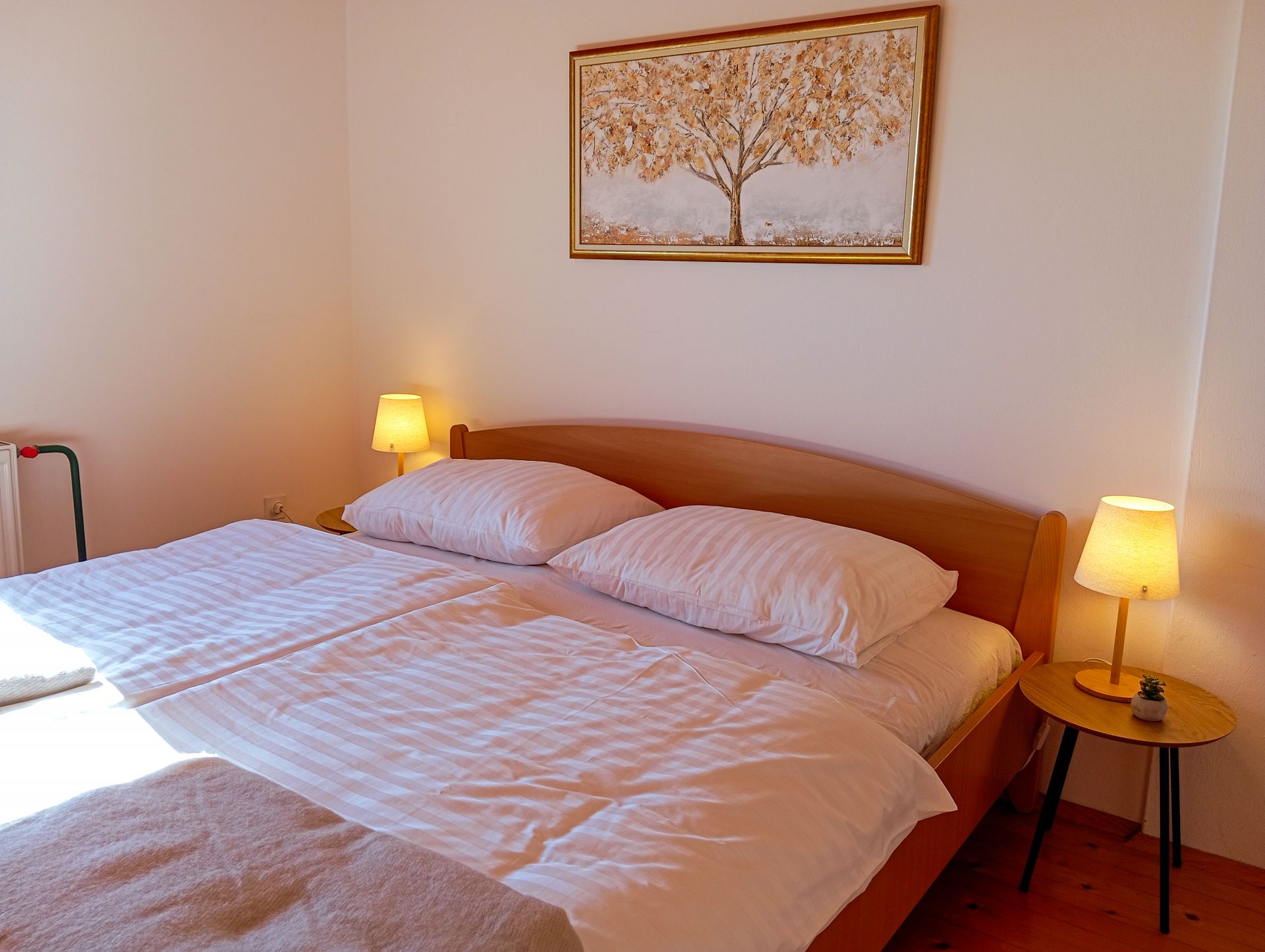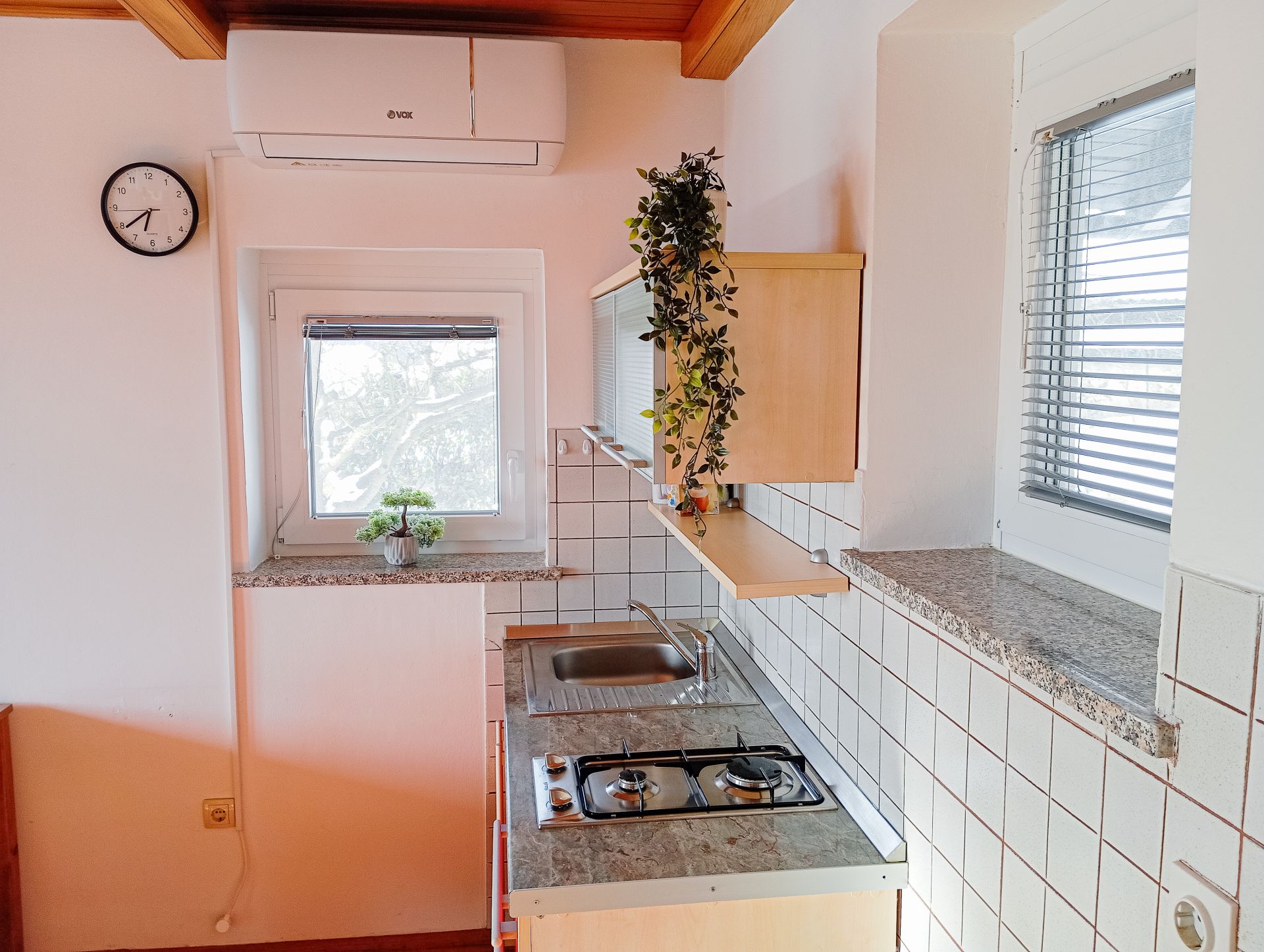 Vineyard Cottage Tilka can accommodate 4 people and is equipped with a fridge (with freezer compartment), microwave, washing machine, TV and Wi-Fi. There is a living room with a kitchenette and dining area, and a sofa that can be converted into a bed. Central heating is provided, and a fireplace adds extra warmth for winter guests, giving the room a special homely charm (don't worry, access is uninterrupted even in winter).The cottage also has a bedroom with double bed, a bathroom and an additional single room with a desk (workation & digital nomad – friendly). There is a small room next to the hallway where you can put your luggage. All windows have mosquito screens and blinds.