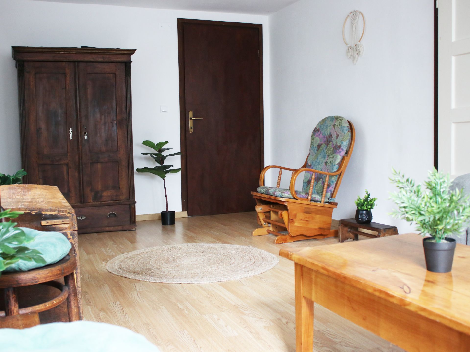 Notranjost odseva rustikalno toplino: starinsko pohištvo, polno opremljena kuhinja, ločen WC, pralni stroj, klima, ogrevanje na drva ali elektriko, WiFi in TV. Dve zunanji terasi vabita k jutranji kavi ali večernemu vinu, z razgledom na hribe, doline in vinograde. Na vrtu stoji mogočna 300-letna bukev, ki tiho šepeta zgodbe preteklosti.